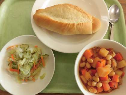 今日の給食は、ソフトフランスパン・牛乳・ポークビーンズ・コールスローサラダです。