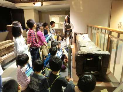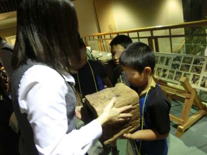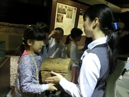 木でできた水道管を観察しました。一部分でしたが水道管に実際に触れることもできました。ずしりと重い水道管にみんな驚いていました。
