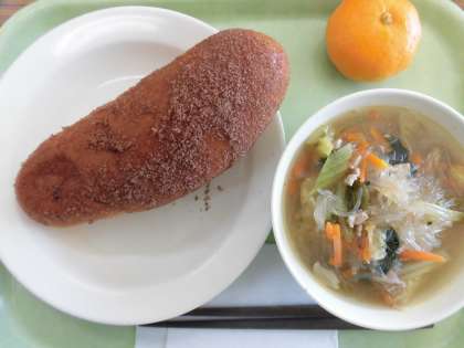 今日の給食は、ココアあげパン・牛乳・白菜と春雨のスープ・くだものです。