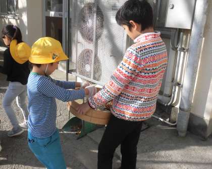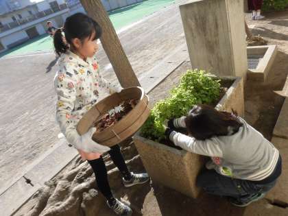 高学年の子供たちと低学年の子供たちが協力する姿もたくさん見られました。みんな一生懸命に落ち葉を拾いました。プランターや芝生まで心を配る子供たちの姿もありました。みんなで協力して取り組むと、あっという間にたくさんの葉っぱを集めることができます。