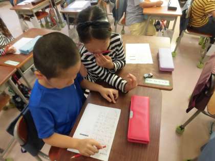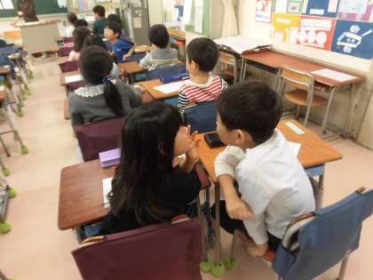 1年生の学習では、自分の考えや願いや思いを友達と伝え合う学習を多くの場面で取り入れています。1年生という発達段階を踏まえ、1対1の対話を大切にしています。お隣のお友達と自分の考えを伝え、聞き合っている様子です。