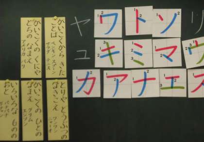 1年生の国語の授業の様子です。「かたかな」の学習をしました。この時間は「かたかなで書く言葉をたくさん見つけ、もっとかたかなとなかよくなろう。」というめあてをもちました。みんなでひらがなとカタカナをマッチングしました。空中でカタカナを書きながら、学習を確かなものにしていきました。カタカナを使う場面もしっかり勉強しました。