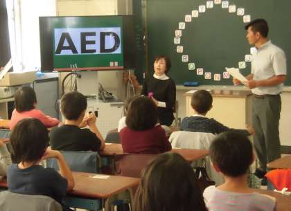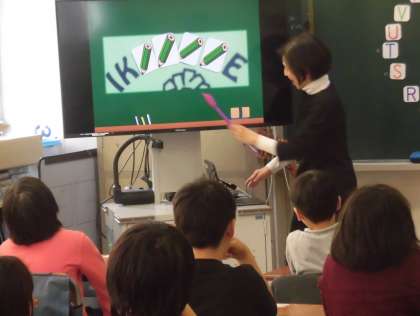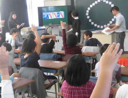 身の回りにあるアルファベットをクイズ形式で探しました。隠さされた文字に注目しながら、楽しく学びを深めることができました。池之上小学校内にも身近な地域にもたくさんのアルファベットが使われていることに気づきました。みんなで一文字一文字、何度も声に出して発音もしました。