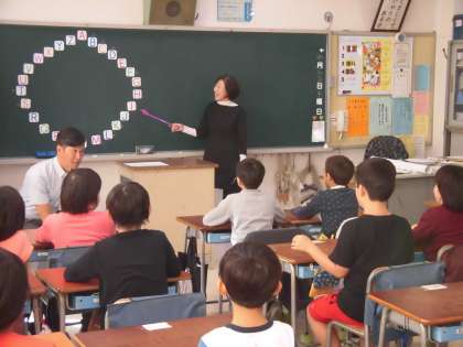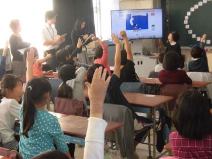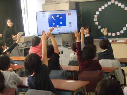 3年生の外国語活動の様子です。「ALPHABET アルファベットとなかよし」という単元を通して、アルファベットの大文字とその読み方に慣れ親しむことを目標にしました。加えて、「持ち物、学校内の表示や物品、地域の標識や看板など、自分の身近な場所で、多くのアルファベットに囲まれて生活していることに気付くこと」「学習を通して、アルファベットへの興味・関心を高め、外国語に触れることを楽しんだり、外国語に進んで触れようとしたりする態度を育てること」を目標にしました。アルファベットの歌を歌ったり、クイズを楽しんだりして学習がスタートしました。