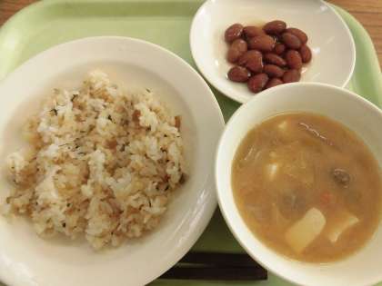 今日の給食は、菜めし・牛乳・いわしのつみれ汁・煮豆です。
