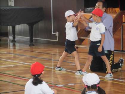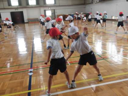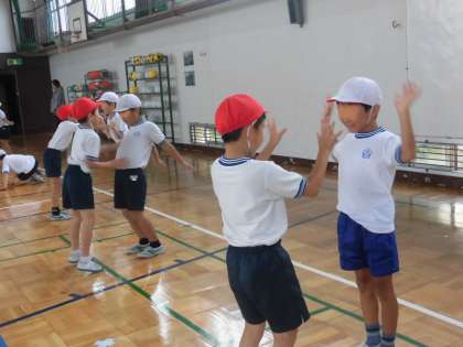2年生の体育の授業の様子です。学年で合同で行いました。最初に、体全身を使って、強めたり緩めたりしながら「多様な動き」に取り組みました。押し相撲も多様な動きの一つです。ペアを組んで楽しく運動する子供たち。ひねったり押したり引っぱたりしながら運動を楽しみました。