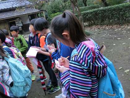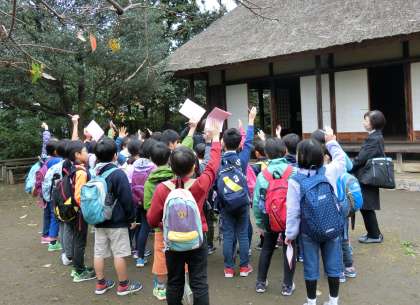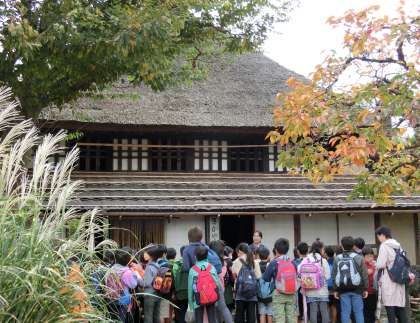 3ヶ所目の見学場所は、次大夫堀公園です。江戸の民家や生活を再現している公園の中で、いろいろなことを教えていただきました。農家の一般的な家には部屋が4つあることが多いことや、その4つの部屋は田んぼの「田」の字のように並んでいること、トイレは外にあったことなど、新しい発見でいっぱいでした。子供たちがいつでもメモを一生懸命にとる姿に感心しました。自然の豊かさにも驚きました。鳥が美しい声で鳴いていてその声に耳を傾けました。