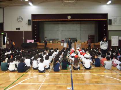 不審者が警察に逮捕されたことが校内に放送されると、体育館に集合して、子供たち全員の安全を確認しました。その後、今日の訓練に協力していただいた北沢警察署の警察官の皆様が不審者対応について大切なことをお話してくださいました。「お・か・し・も・ち」をしっかり守ること、「お・か・し・も・ち」を思い出しながら行動することの大切さです。みんな真剣に聞くことができました。お礼をしっかりして、不審者対応訓練を終えました。