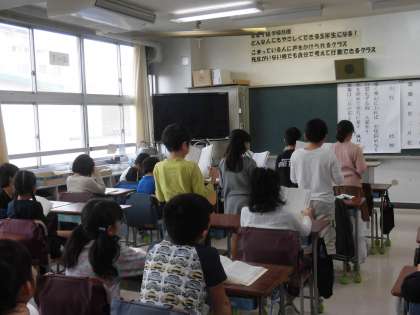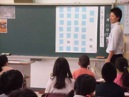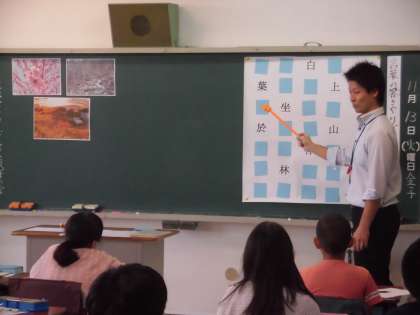 グループごとでも朗唱を重ねました。何度も繰り返し朗唱することで、日本語の響きやリズムを楽しみました。漢詩の白文の文字を少しずつ隠しながら朗唱しました。子供たちは、すでに暗唱しているようで、目を輝かせながら「先生、もっと隠しても大丈夫だよ。」とつぶやいていました。「1文字だけ残して、後は全部隠してね。」とリクエストの声も上がりました。子供たちは朗唱を繰り返すうちに、漢詩に描かれている情景や思いへの想像を膨らませました。朗唱もどんどん上手になっていきました。子供たちの吸収力のすばらししさに感心するばかりでした。