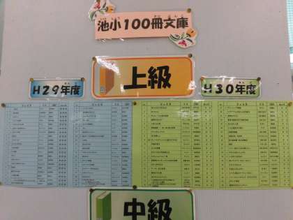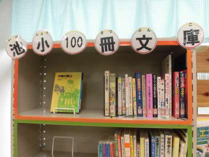 池小 100冊文庫コーナーもあります。子供たちに読んでほしい本を選書しました。