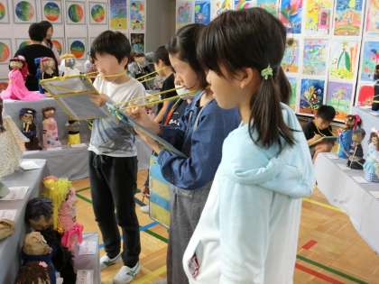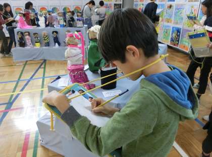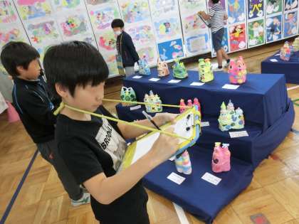 たくさんのすてきな作品を熱心に鑑賞しながら、作品のよさや工夫されている点について、メモを取っている5年生の姿がありました。みんな真剣です。メモがいっぱい取れました。友達のよさをたくさん見つけたようです。