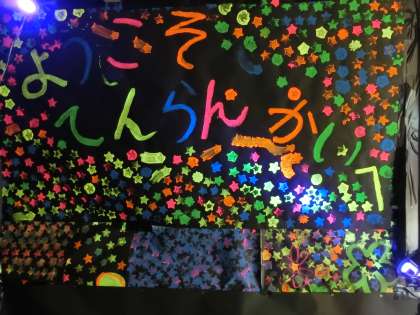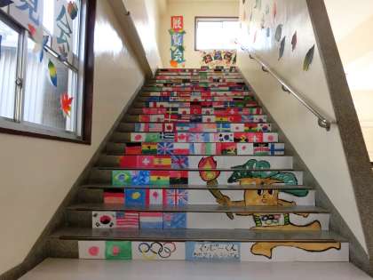 共同作品も作りました。1年生「ようこそてんらんかい」、2年生「階段アート」、3年生「光の展示」、4年生「透明の垂れ幕に表現した展覧会スローガン」、5年生「木製の展覧会案内板」、6年生「会場入り口を飾った大きな絵」です。この作品は、鑑賞にお越しいただいた皆様をあたたかくお迎えする、子供たちの心のあらわれです。