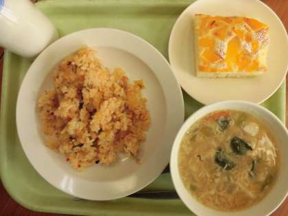 今日の給食は、キムチチャーハン・牛乳・中華風コーンスープ・ピーチケーキです。