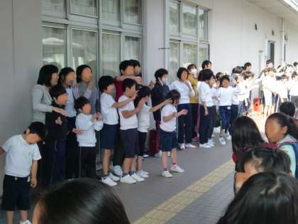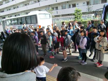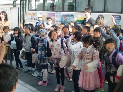 青光学園の子供たちが雨の中でしたがお見送りをしてくれました。池之上小学校の4年生も手を振って応えていました。両校の子供たちの様子を見ていると、今日のこの交流が充実していたことがわかります。2回目の交流が今から楽しみです。