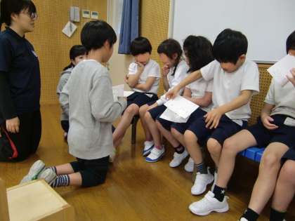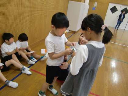 交流活動では最初に、お互いが作った名刺交換を行いました。少し緊張気味の子供たちもいましたが、すぐに仲良くなれました。