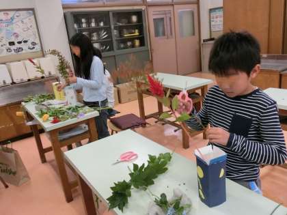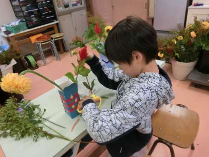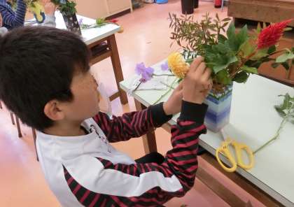 子供たちは、花と対話をしながら自分の世界を表現していきました。自分で生けた花をぜひご家庭に飾っていただき、花の一生を感じ取ってほしいという願いから、お花をご家庭に持ち帰ります。「道」の世界について子供たちと話題にしていただけましたら幸いです。ご家族の皆様でお花を楽しんでいただければと思います。