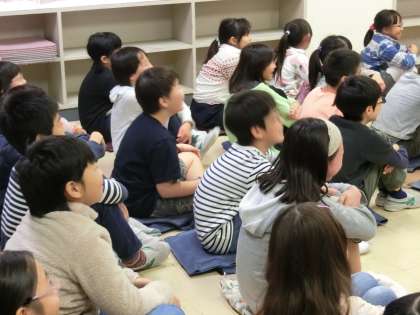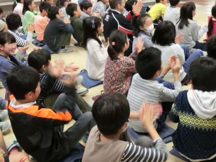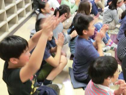 楽しいお話に思わず前のめりになる子供たち。真剣に聞いています。時には大笑いも。大きな拍手も起こります。子供たちの想像力のすばらしさをほめていただきました。言葉や表情、動作から、様々なことを想像していきます。この想像力・・・実に大切な子供たちの力です。豊かな想像力をもつ子供たち、これからもたくさんの場でこの力を発揮してくれることでしょう。