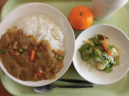 今日の給食は、せたがや大根カレー・牛乳・和風サラダ・くだものです。