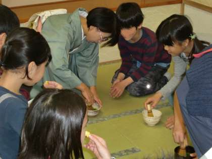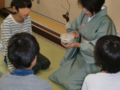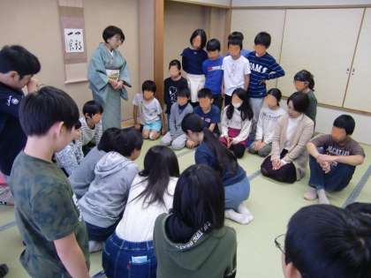 茶道の説明を分かりやすくしていただきました。とても熱心に聞いている5年生。聞き方のすばらしさに感心しました。手の役割、手が表す心遣いのお話に、自然と動きや形を確認する子供たち。子供たちの姿から真剣さが伝わってきました。