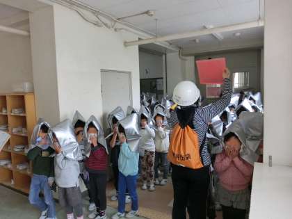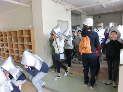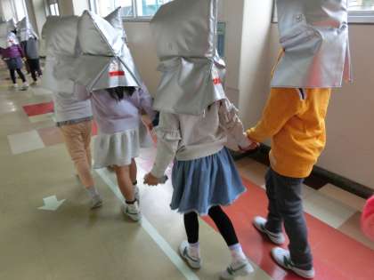 廊下にも煙が充満しました。あたりが見えにくくなっています。先生から「壁伝いに歩いていきましょう。」と声がかかりました。低学年の子供たちはペアの友達としっかり手をつなぎ、離なれず行動する練習をしました。廊下が混雑すると上学年が下学年に譲る姿が見られました。