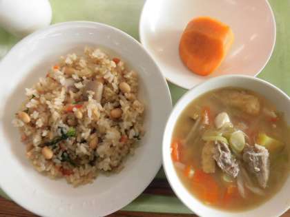 今日の給食は、栄養五色ごはん・牛乳・さつま汁・くだもの(柿)です。
