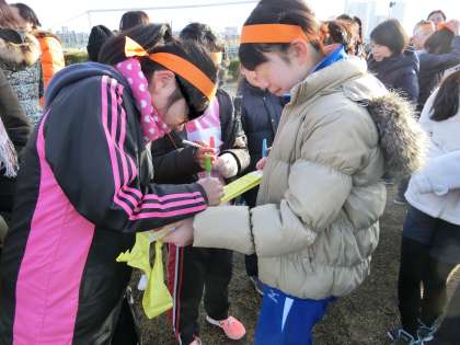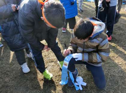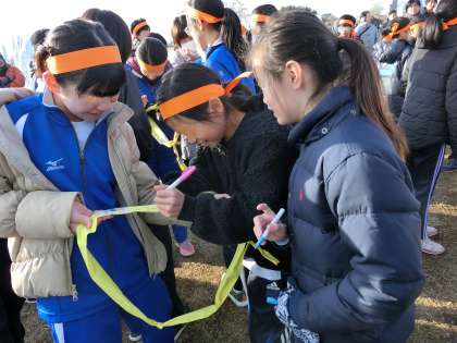 富士の学び舎4チームは「チームせせらぎ」と名前をつけました。たすきに共に走る仲間たちで名前を刻みました。いよいよ子ども駅伝、スタートの時刻を迎えます。