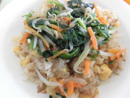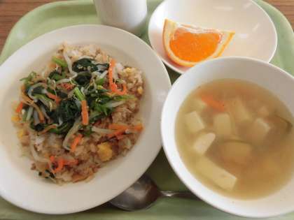 今日の給食は、ビビンバ、牛乳、ザーサイスープ、くだもの(はれひめ) です。