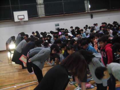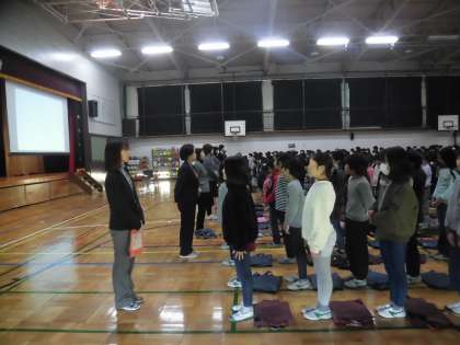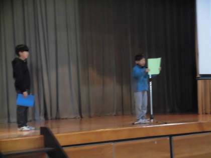 12月25日、2学期が終了する日を迎えました。写真は終業式の様子です。先生とみんなでしっかり礼をして式が始まりました。終業式では、代表の子供が2学期を振り返って、自分の成長の様子やがんばったことを皆の前で述べました。「友達と一緒にいろいろなことをがんばりました。がんばったらがんばった分だけいいことがありました。・・・これからも友達を大切にしていきたいです。友達はぼくにいろいろな思い出を作ってくれます。」「多くの行事を経験しがんばってきました。目標に向かってがんばりました。連合運動会やながなわ大会では、記録が伸びれば友達と一緒に喜び、悔しいときも友達と一緒に思いを寄せました。」二人の代表の子供たちが共通して話したことは、「友達の大切さ」と「目標に向かって努力することの大切さ」です。立派に代表の言葉を述べることができました。ここにいるすべての子供たち一人一人の心に、それぞれ違った自分の成長が思い描かれたことでしょう。節目節目の振り返りはとても大切なことです。3学期に生かすことができるすてきな振り返りの時間となりました。