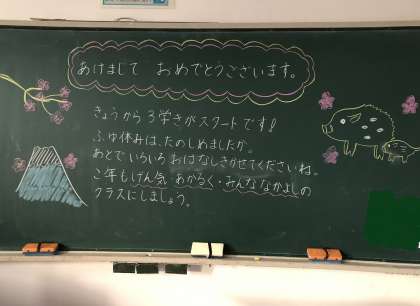 3学期も371名の子供たちがそれぞれ自分の目標に向き合っていきます。みんな違う371のゴールに向かって努力し続ける3学期になってほしいと願っています。教室では担任からのメッセージが添えられているクラスもありました。「いっしょにがんばっていきましょう。みんなのえがおがたくさん見られる3学期にしようね。」「今年も元気・明るく・みんななかよしのクラスにしましょう。」「たくさんの思い出を胸に、新学期のスタートです。」「3学期もえがおでがんばりましょう。」「たのしいことたくさんして、もっともっとなかよし1組になりましょうね。」と、みんなでいいクラスをつくってほしいという願いが込められました。始業式では「教室はまちがうところだ」という詩を一部ですが紹介しました。「いくども いくども おんなじことをくりかえすうちに それからだんだん どきりがやんで 言いたいことが 言えてくるのだ はじめからうまいこといえるはずないんだ はじめから答えがあたるはずないんだ まちがえだらけのぼくらの教室 おそれちゃいけない わらっちゃいけない 安心しててをあげろ 安心してまちがえや まちがったたって わらったり ばかにしたり おこったり そんなものはおりゃあせん まちがったって だれかがよ なおしてくれるし 教えてくれる そんな教室 作ろうやあ」・・・そんな内容です。恐れないでいろいろなことに挑戦し、その挑戦をあたたかな気持ちで応援し合える学級をつくっていきたいです。