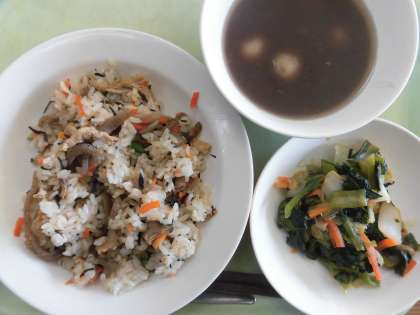 今日の給食は、五目ごはん・牛乳・煮びたし・白玉しるこです。