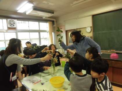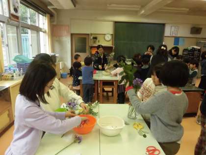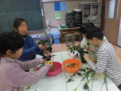花がよりすてきに見えるように友達とたくさん話し合いました。高さや広がりを工夫していました。時には考え方が異なるときもありましたが、みんなで納得がいくまで話し合っている姿をほほえましく感じながら子供たちの活動を見守りました。