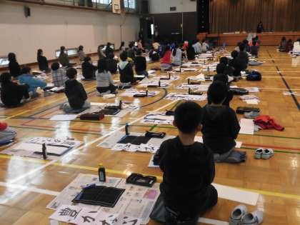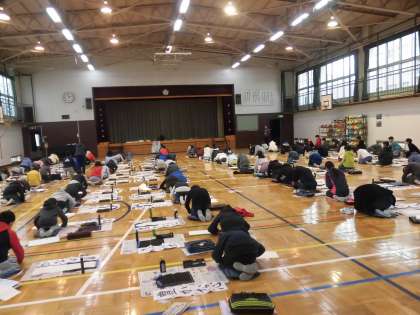 子供たちの後ろ姿からも「書き初め大会」に真剣に取り組もうとする心が伝わってきます。