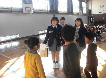 池之上小学校では、国際理解の推進として、年3回、近くの都立国際高等学校の生徒の皆さんとの交流活動を行っています。1月19日に第2回目の活動を行いました。子供たちが体育館に高校生たちをお迎えに行きます。みんな緊張気味でしたが、目を見てあいさつしてコミュニケーションを交わすと、あっという間に笑顔が広がりました。
