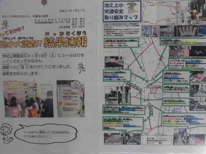 1月21日、「池小大調査!!結果速報」が玄関に掲示されました。学校公開最終日、1月19日に取り組んだ「池小大調査!!」の結果です。子供たち、大人たちの実態を交通安全に生かしていこうというこの取り組み・・・池之上小学校の子供たち、そして子供たちの環境を支える私たち大人の交通安全への意識の向上につながっていくこととでしょう。