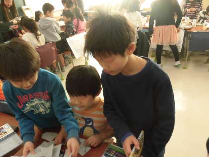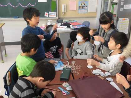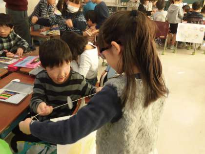 2年生がこれまで準備してきた手作りおもちゃは、わくわくするような楽しさでいっぱいです。1年生もたくさんのコーナーをまわって、2年生に囲まれながらわくわくパーティを楽しんでいました。