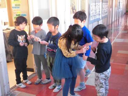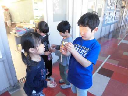 手作りおもちゃができあがったら、廊下で飛ばしてみるグループもありました。「周りをよく見て誰もいないときに飛ばしてね。」「ここにゴムをかけると遠くに飛ぶよ。」「がんばってやってみてね。」など・・・2年生の優しい心とふわふわ言葉がたくさん飛び交いました。