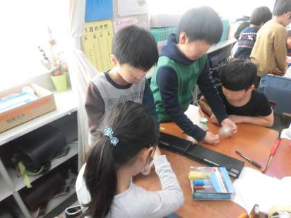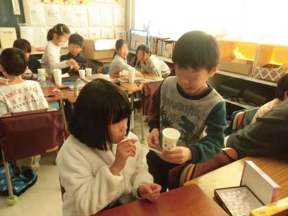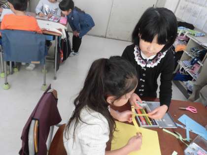 2年生は1年前の「わくわくパーティ」を思い出しながら優しく1年生に接していました。1年生は教えてもらったことを生かして、2月21日に実施する「新1年生をお迎えするパーティ」の準備に生かしていきます。椅子に座っているのが1年生、2年生はその傍らで一生懸命に自分で学んできたことを教えています。