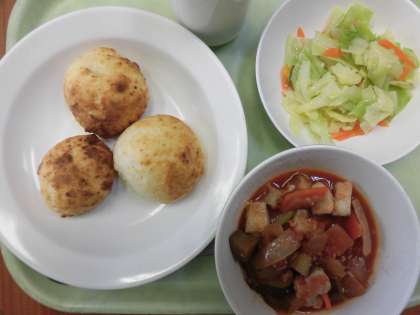 今日の給食は、ポンデケージョ・牛乳・ムケッカ・きゃべつサラダです。
