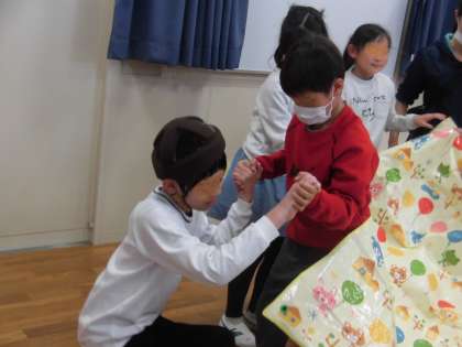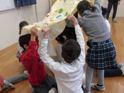 どの場の状況に応じて、ゲームのルールを工夫したり、声掛けしたりする子供たち。どのグループもすてきな時間をつくりあげていました。下の2枚の写真は、鬼役の池之上小学校の子供が登場すると「鬼が来たぞ!」と布の中にみんなで隠れるゲームです。