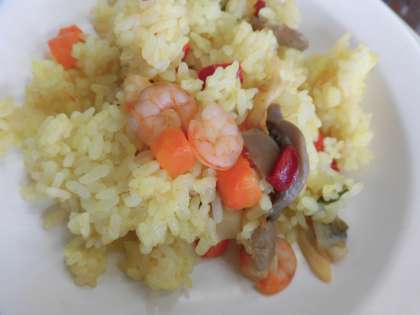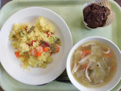 今日の給食は、パエリア・牛乳・ヌードルスープ・栗ココアマフィンです。