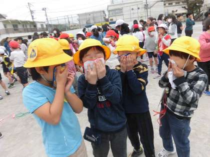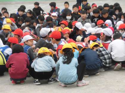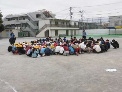 2月の避難訓練が13日に行われました。2月は、子供たちへの予告なしの訓練です。しかも休み時間。これまでの訓練で学んだことを様々な状況に合わせて生かしていくことが大切です。校庭で遊んでいた子供たちは、「地震です。大きな地震が発生しました。」と放送が入ると、校庭の中央に集まることができました。集まった子供たちは、これまでに習ったダンゴムシのポーズで身を守ります。次の指示がでました。「地震後に理科室から火災が発生しました。校庭に集合します。」この放送を聞いた多くの子供たちがハンカチで口元をおさえ、煙を吸い込まないように行動を起こしました。立派です。避難訓練でたくさんのことを学習してきました。学びを生かせる子供たちになってほしいと願っています。