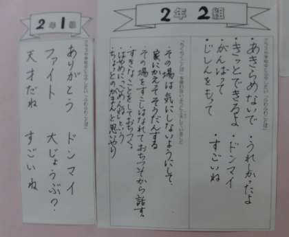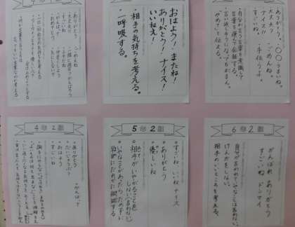 1月「ふわふわ言葉」を大切にする取り組みを行いました。今年度は学級会の時間を使って話し合いを充実させました。「クラスや学校中に増やしたい『ふわふわことば』」や「『ちくちくことば』を使わないように工夫していること」などについてみんなで一生懸命に考えました。各クラスの話し合いの結果を中央玄関パネルに掲示しました。多くのクラスが「ありがとう」という言葉を選んでいました。大人の私たちも子供たちに「ありがとう」をいっぱい伝えたいと思っています。