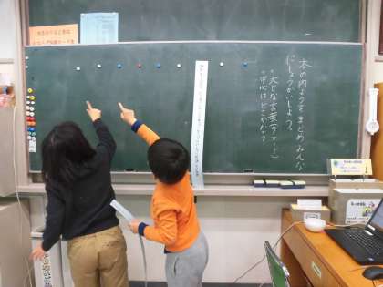 グループごとにまとめた絵本の内容を紹介し合いました。比べながら聞いていると、9冊の絵本の共通テーマに気づきはじめる子がいました。学校図書館司書の方にも授業に入っていただき、それぞれの絵本の内容を解説してくださいました。今日の授業は、これまで学習してきた「身ぶりのはたらき」の発展学習・・・子供たちの学びがたくさん生かされた授業になりました。
