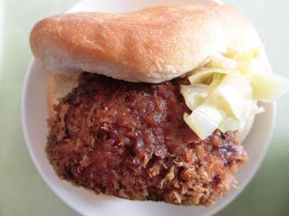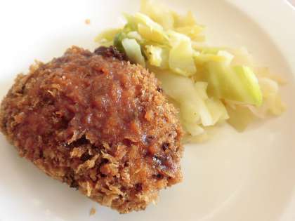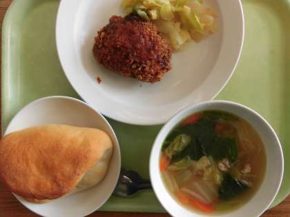 今日の給食は、マーガリンパン・牛乳・メンチカツ・きゃべつソテー・白玉スープです。