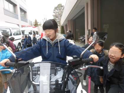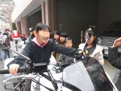 初めて白パイに乗る子供たち。みんな大はしゃぎです。友達が体験している様子を見て「かっこいい」「似合っているよ」と歓声と拍手が起こりました。貴重な経験になりました。