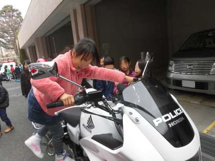 本物の白バイを目の前にして、お話をうかがいました。とても大きくて重たそうです。赤橙がたくさんついていることも発見しました。そして・・・なんと一人一人が白バイに乗る体験の時間をつくっていただいたのです。