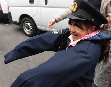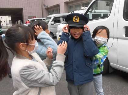 帽子や制服も着させていただきました。「似合っているよ」と声を掛け合いながら、大きめの制服を着てうれしそうに笑顔になる子供たち。いろいろな体験をさせていただきました。先生も体験し、みんなで敬礼のポーズをとりました。