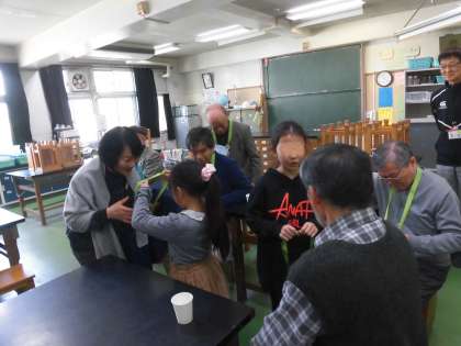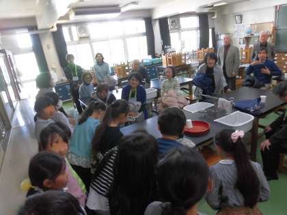 2月21日、3年生の社会の学習の支援に地域の皆様が参加してくださいました。3年生は、今、昔の様子を学習しています。当時の食事や文房具や学校など、たくさんのことを教えていただきました。子供たちも真剣に聞いています。質問も次から次に出てきます。写真は、理科室にお迎えにいたっ時のものです。名札をプレゼントし「よろしくお願いします」のあいさつを元気にしました。担当の子供たちが手をつないで地域の皆様を教室にご案内しました。