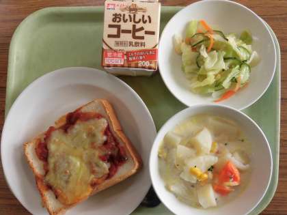 今日の給食は、ピザトースト・コーヒー牛乳・ポテトスープ・コールスローサラダです。