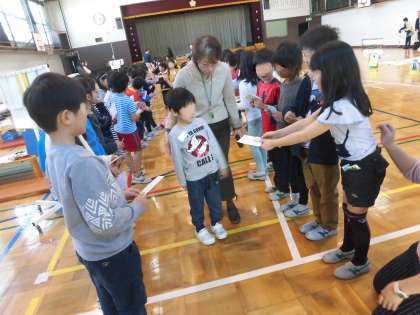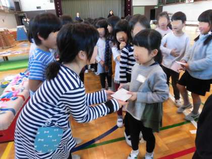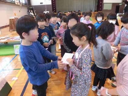 楽しい時間はあっという間に過ぎていきました。「わくわくパーティ」も終わりです。最後に1年生が大切に育てたアサガオの種をプレゼントしました。心を込めてお手紙も書きました。この種が次の1年生に引き継がれ、また芽を出し、花を咲かせます。1年生の思いがいっぱい詰まったプレゼントでした。